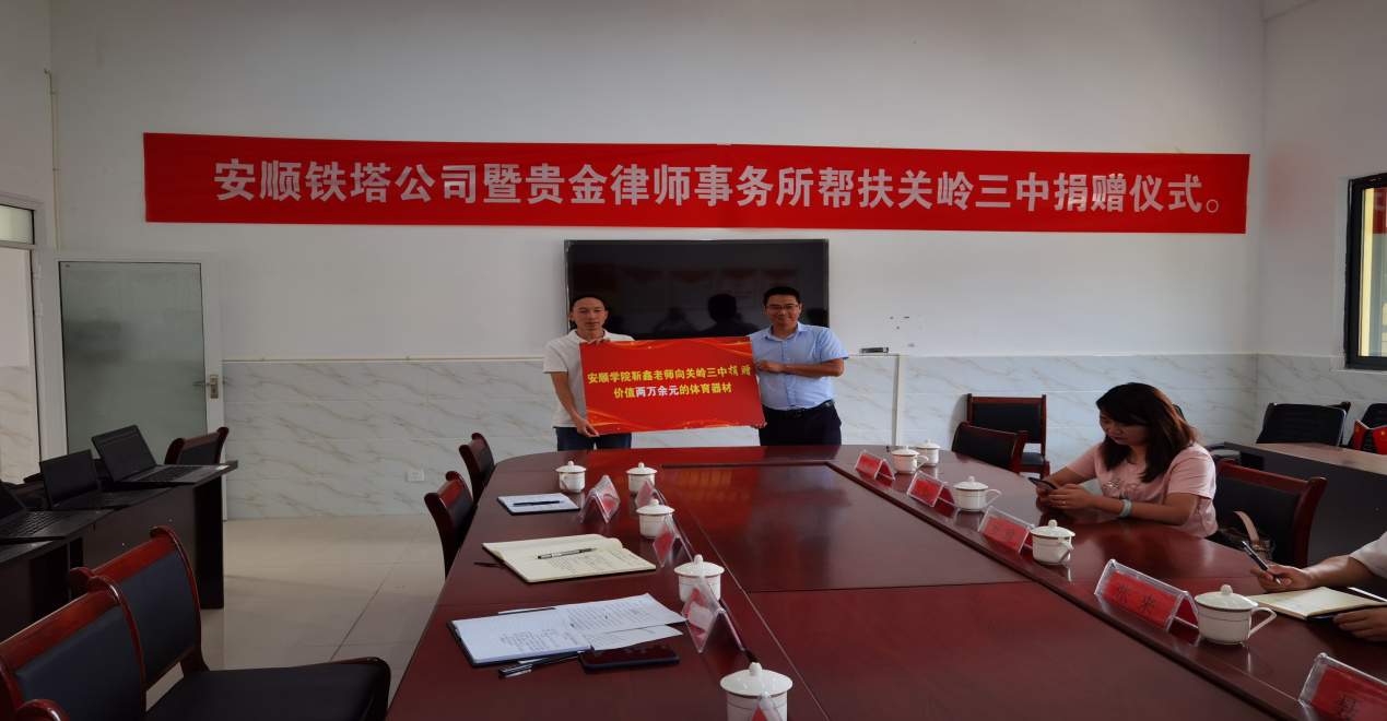 中国铁塔安顺市党支部书记、副总经理(主持工作)聂永同志表示,此次对关岭三中的物资捐赠是尽集团公司的社会义务,是国有企业参与脱贫攻坚的一种形式。他希望在下一步加深校企合作,在工作中加深了解。针对关岭三中的情况,进一步加深在集团社会实践方面和集团培训方面的优势作用,为关岭三中发展尽集团的绵薄之力。贵君律师事务所律师、安顺学院教师靳鑫同志指出,在脱贫攻坚战场中,尽自己的微薄之力助力脱贫攻坚、助力关岭三中的发展。