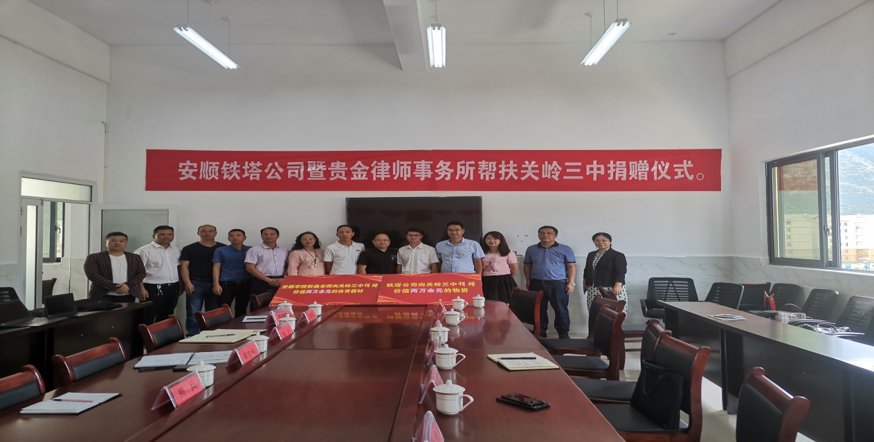 为深入推进安顺学院领办关岭三中工作,谱写易地扶贫搬迁“后半篇文章”,在安顺学院驻关岭三中工作站的引荐下,2020年8月21日,中国铁塔股份有限公司安顺市分公司举行向关岭自治县第三中学进行物资捐赠仪式。安顺学院副校长张来教授,中国铁塔安顺市党支部书记、副总经理(主持工作)聂永,安顺学院教师靳鑫及相关职能部门负责人参加捐赠仪式,捐赠仪式由安顺学院驻关岭三中工作站站长刘兴丽主持。